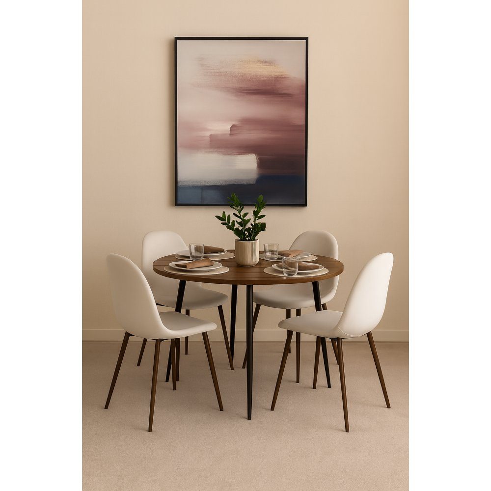 Matgruppen Dana & Alfred förenar varm träkänsla med modern elegans i en balanserad och inbjudande design. Det runda Dana matbordet har en skiva i valnötsmelamin med naturlig trästruktur och subtila längsgående skåror som ger en genuin och stilren karaktär. Det svarta metallunderredet med smala, konformade ben skapar en luftig kontrast till den varma bordsskivan, vilket ger ett elegant uttryck som passar både moderna och klassiska miljöer.