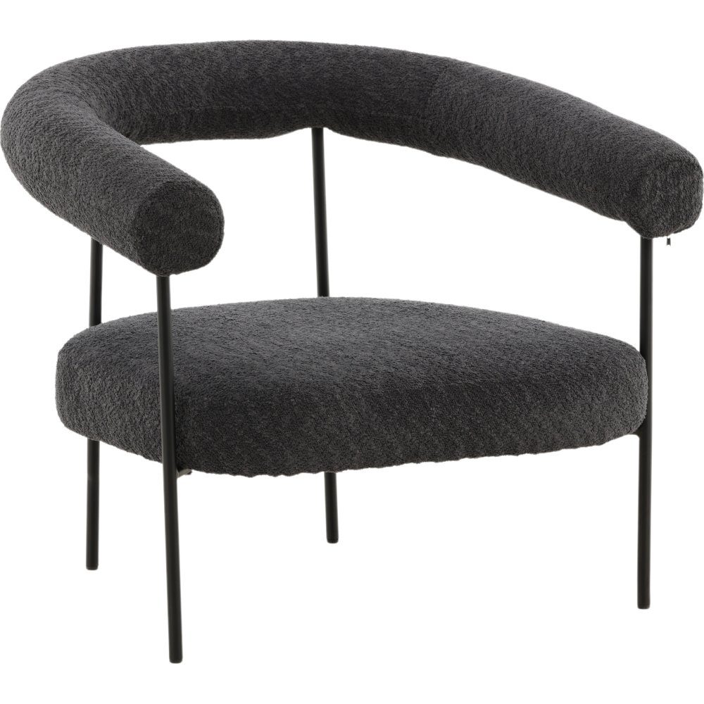 Fåtölj med inbjudande nordiska former. Fåtöljen är formad likt en halvmåne och har en bekväm och rymlig sits, klädd i ett trendigt grått boucletyg. Ramkonstruktionen är minimalistisk i svart stål och den enkla designen ger en luftig känsla. Placera brevid soffgruppen eller varför inte ensam som en vacker inredningsdetalj.