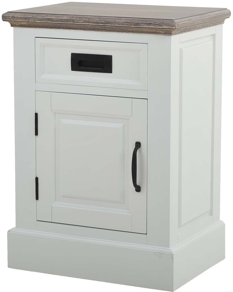 Knight sängbord kombinerar modern design med klassisk charm. Det stilrena sängbordet i vitt och grått har en låda och en dörr som ger praktiskt förvaringsutrymme, medan de svarta handtagen skapar en elegant kontrast till det ljusa utförandet.
