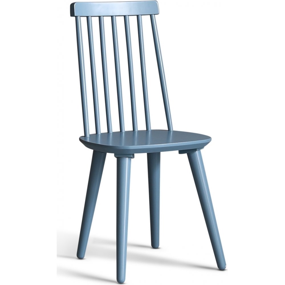 Dalsland matgrupp med runt matbord med toppskiva i oljad ek och vitlackat underrede. Dalsland pinnstolar i en läcker duvblå lack (RAL5007)