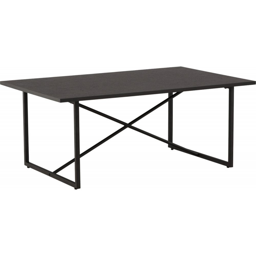 Bord med raka skandinaviska former och dekorativa detaljer som skapar ett iögonfallande blickfång. Bordsskivan är i svart MDF och underredet i svart stål med ett smakfullt kryss som sammanlänkar de raka bordsbenen. Den generösa storleken gör att bordet passar utmärkt framför den större soffan och den svarta kulören är enkel att matcha med övrig inredning.